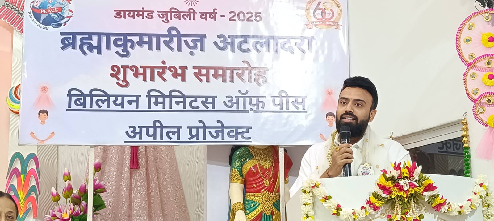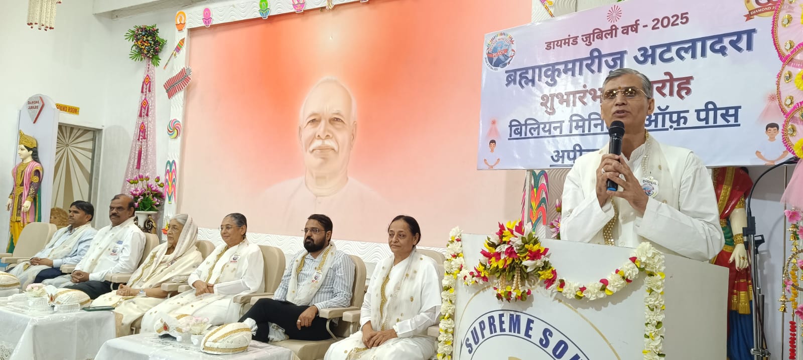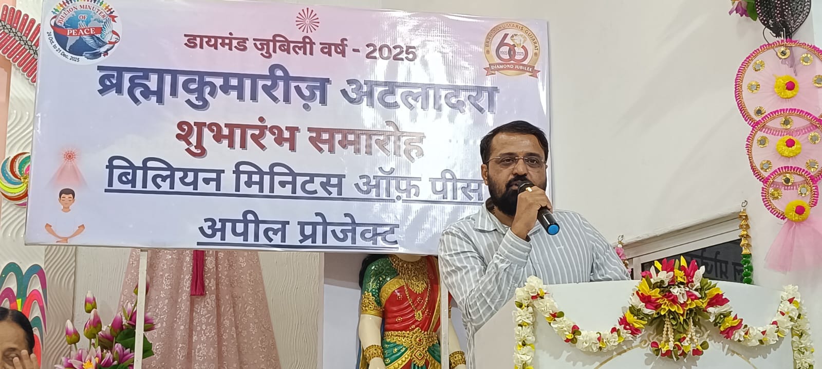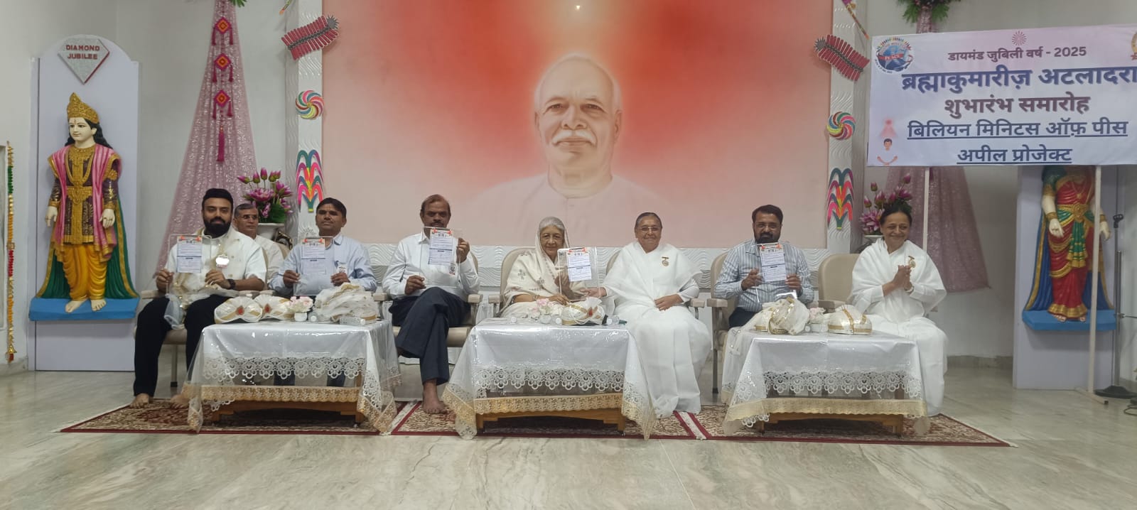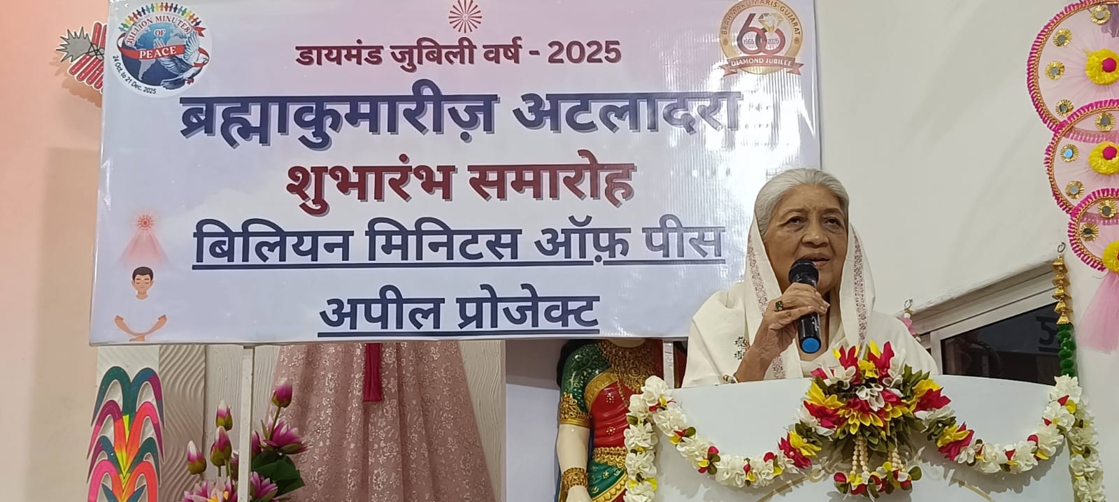ब्रह्माकुमारीज़ के गुजरात जोन की सेवाओं के 60 वर्ष पूर्ण होने की हीरक जयंती के शुभ अवसर पर सारे गुजरात में किए जा रहे कार्यक्रम के अंतर्गत बड़ोदरा के अटलादरा सेवाकेंद्र में “बिलियन मिनट्स ऑफ़ पीस अपील-विश्व शांति परियोजना” का शुभारंभ किया गया। इस परियोजना में 24 अक्टूबर यूनाइटेड नेशन (UN) डे से 21 दिसंबर विश्व ध्यान दिवस तक संगठित रूप से विश्व को शांति का सहयोग देने की सेवा की जाएगी। इस अवसर पर सकारात्मक ऊर्जा से ओतप्रोत अनेक गणमान्य अतिथि, समाजसेवी, शिक्षाविद् और नागरिक कार्यक्रम में उपस्थित रहे।